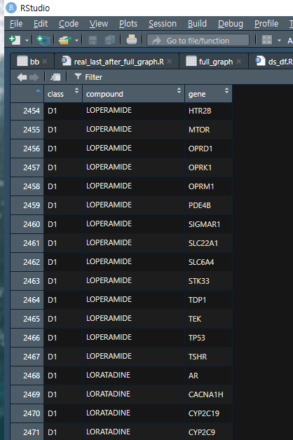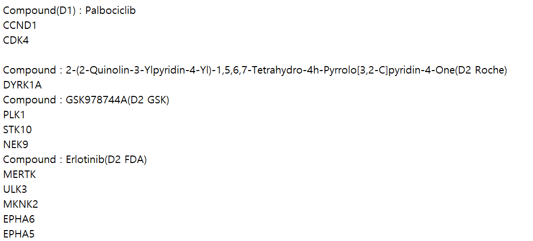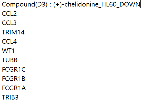 이런 데이터에서 compound(d1, d3)와 거기에 해당하는 gene을 추출해 DB화 하는 것입니다.