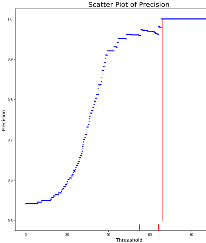 산점도를 보면 임계치가 올라가는데 정밀도는 떨어지는 구간들이 있다.