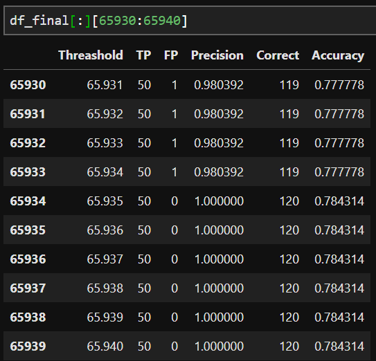 df_final.columns = ["Threashold","TP","FP","Precision","Correct","Accuracy"]