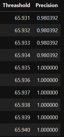 대충 임계치 65.935% 이상부터는 정밀도가 100%라는 의미일텐데...