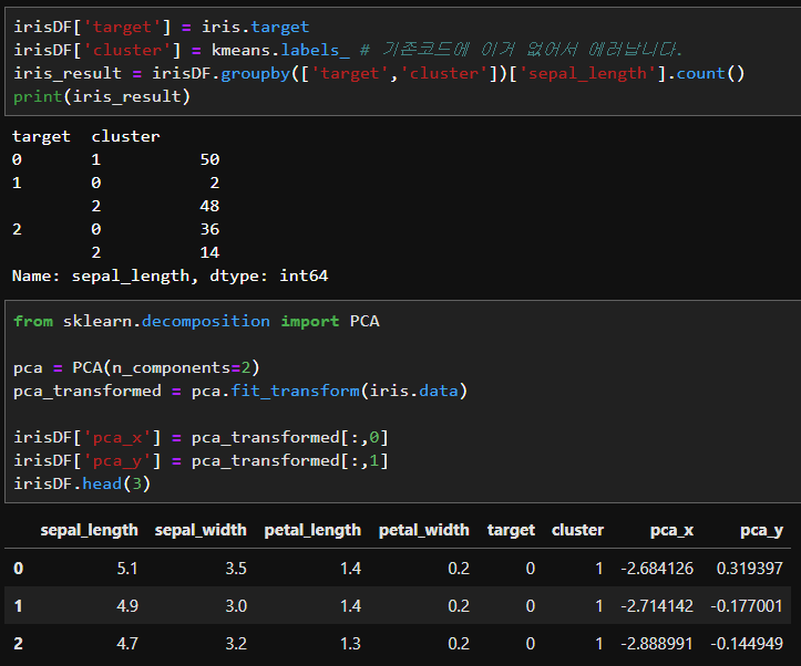 데이터프레임에서 타겟와 클러스터를 정해주고 groupby와 .count를 이용하여 정리해주고