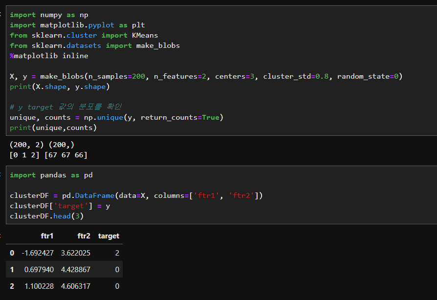 데이터프레임에서 타겟와 클러스터를 정해주고 groupby와 .count를 이용하여 정리해주고
