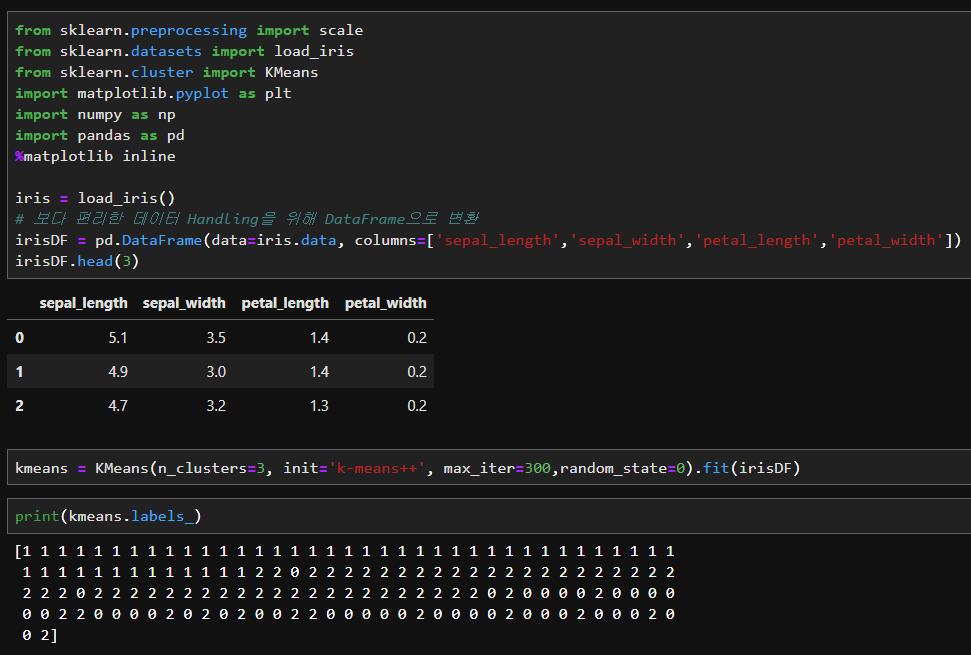 판다스의 대표 데이터셋인 붓꽃데이터셋으로 K-Means를 이용하여 클러스터링을 해 보겠습니다.