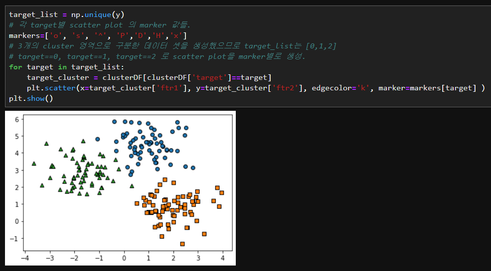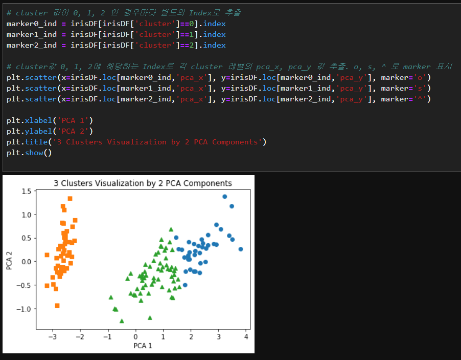 각 클러스터별로 별도의 인덱스로 추출하고 해당index로 각 클러스터의 pca_x, pca_y값을 추출하여 세가지 형태의 marker로 표시해 줍니다.