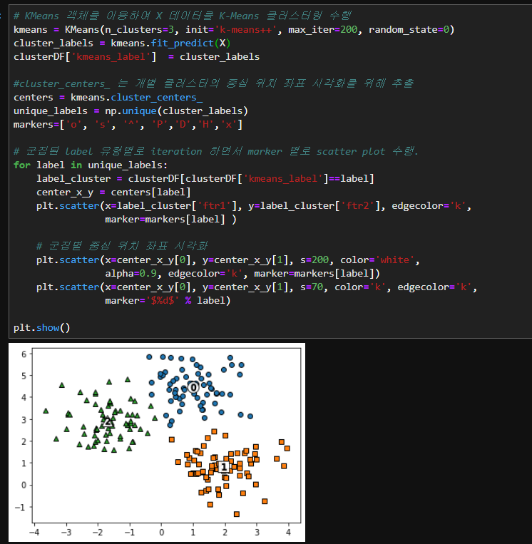 클러스터링을 해준 후 중심위치 좌표 시각화를 위해 센터값을 구한 뒤 군집된 Label 유형별로 나눠서 marker별로 산포도를 그려주고 이전에 구했던 중심위치좌표를 시각화 해 줍니다.