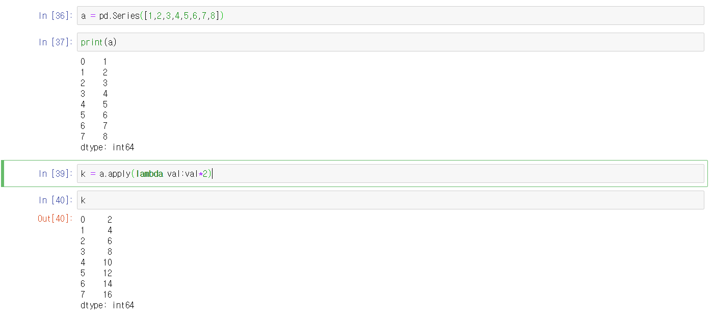 판다스에 series.apply와 lambda 조합이 매우 강력함. for문 돌릴 필요도 없고 형태도 매우 단순함 ( 파이썬 머신 완성한김에 python 학습중 )