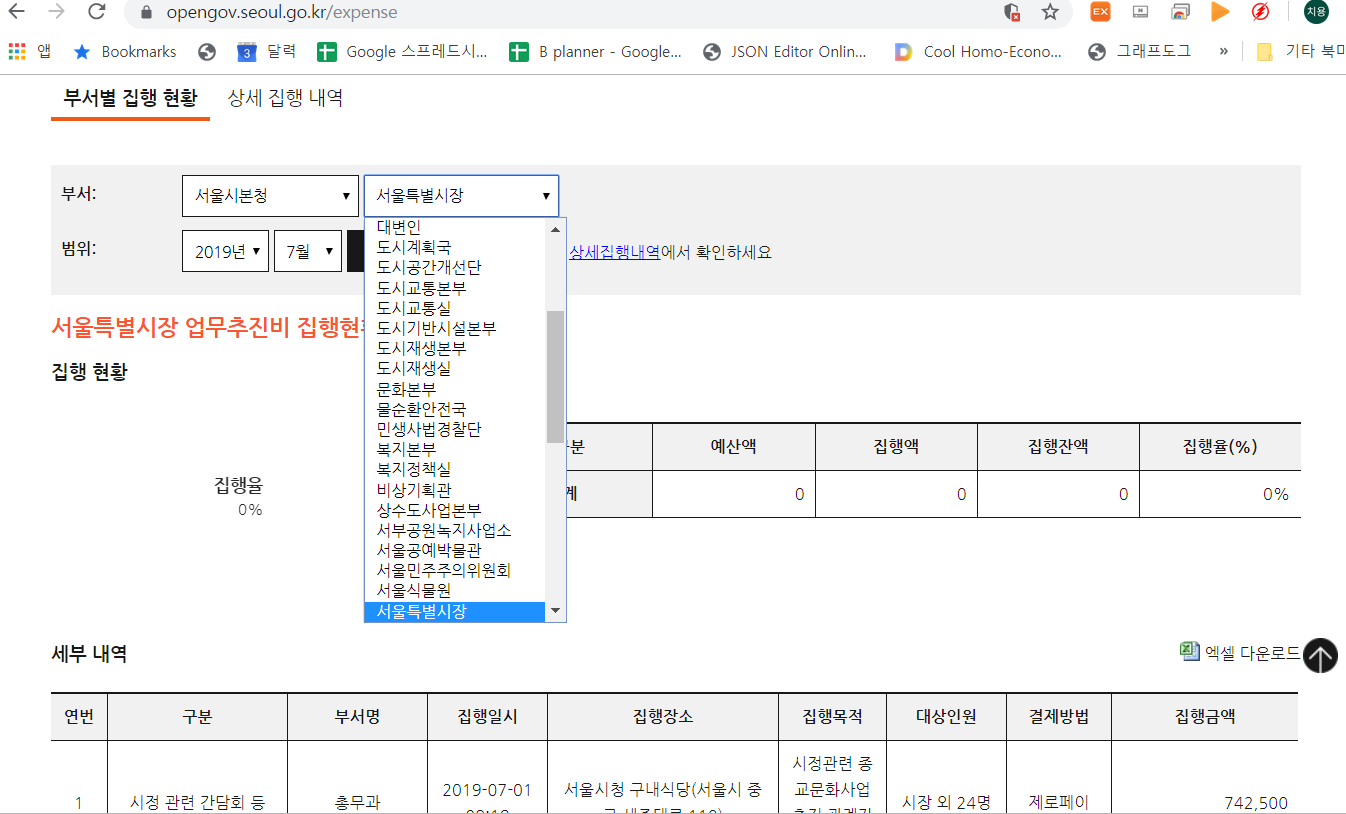 위쪽 동그라미 누르고, 사업소, 서울시본청, 소방재난본부 체크를 해제하면 의회 사무처가 어디서 무슨짓을 했는지 볼 수 있다.