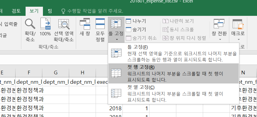 (보기->틀 고정->첫 행 고정)