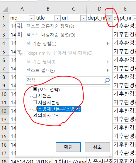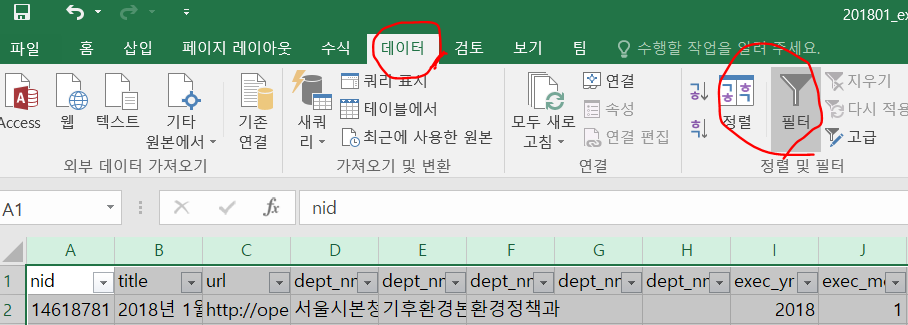 여튼 데이터->필터 를 누르면 제일 윗 캇에 세모 버튼이 생긴다. 동그라미가 삐뚤어진것처럼 보이는건 독자의 마음이 삐뚤어져서 그렇다.