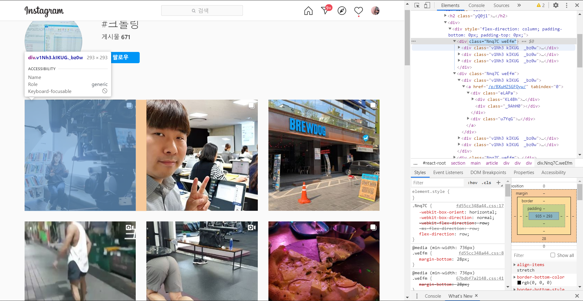 아래와 같이 변수명을 설정해준 후 insta = soup.select('.Nnq7c.weEfm') 괄호안에 넣어 이미지클래스를 선택하여 html 해당클래스를 가진 정보를 가져온다.