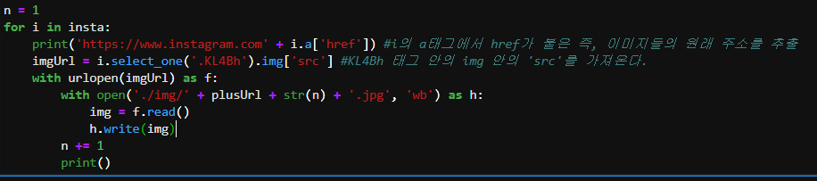 for문을 이용하여 가져온 값들에서 이미지들의 원래 주소를 가져와서 with urlopen를 써서 들어간 후 with open으로 저장해주는걸 반복하는 코드를 적어줍니다.