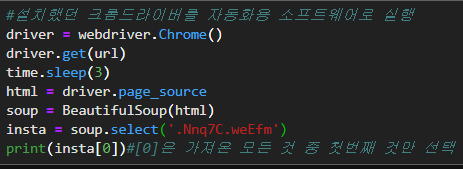 아래와 같이 변수명을 설정해준 후 insta = soup.select('.Nnq7c.weEfm') 괄호안에 넣어 이미지클래스를 선택하여 html 해당클래스를 가진 정보를 가져온다.