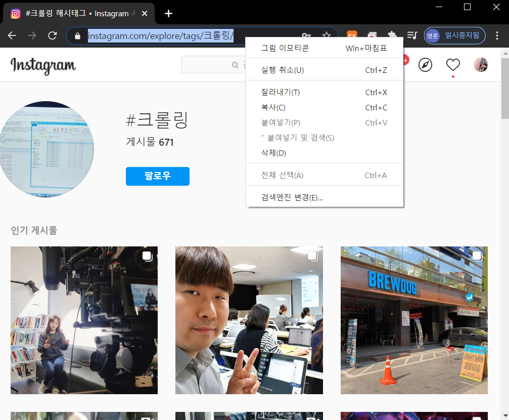 인스타그램에 로그인 한 후 태그검색 하여 해당 url을 복사후 붙여넣기 합니다