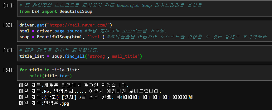 [34] 파싱한 메일제목들을 프린트하여 확인해 줍니다.