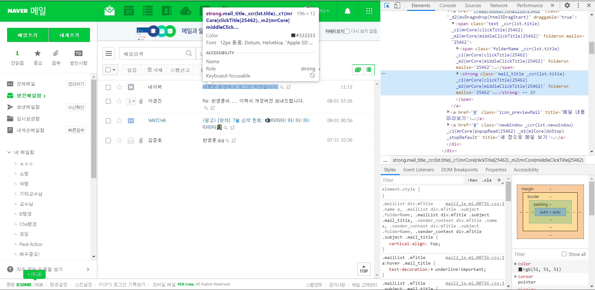 [33] 개발자 환경에서 확인한 메일제목의 태그,class값을 이용하여 파싱합니다.