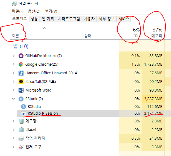 3. ctrl + shift + esc 로 작업관리자를 열어 RStudio R Session을 찾습니다.