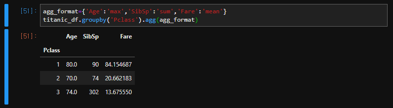 agg_format={'Age':'max','SibSp':'sum','Fare':'mean'}
