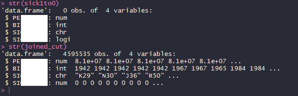 위의 함수str()을 이용해서 각 열의 형태를 확인 한 결과 4번째 열의 형태가 에러코드와 같이 x는 숫자, y는 논리였다(위가 y 아래가 x)