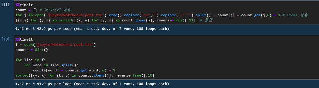 for j in open('jupytorNotebooks/poet.txt').read().replace("\n","").replace(".","").split() : count[j] = count.get(j,0) + 1 # items 생성