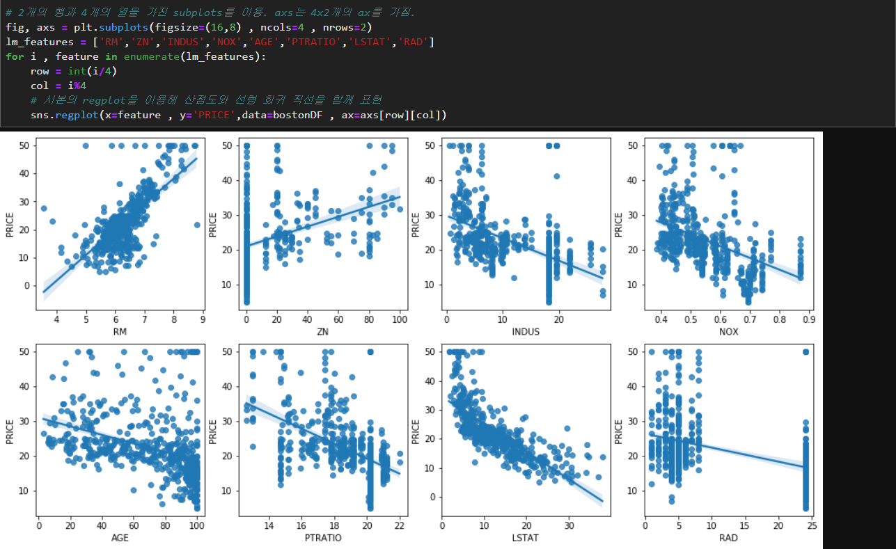 seabornt을 이용하여 각 변수들과 PRICE간의 산점도와 선형회귀 직선을 함께 표현해줌.