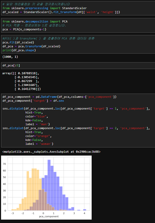 허리둘레와 키 값을 정규화 시켜 준 후 PCA의 컴포넌트를1로 설정해 주고 정규화 하여 PCA 변환데이터를 반환해줍니다.