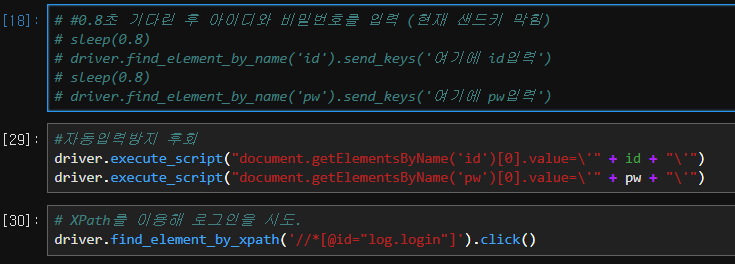 [29] 따라서 스크립트를 이용하여 id와 pw를 입력합니다. (주석에 후회가 아니고 우회입니다;; 후회되네요)
