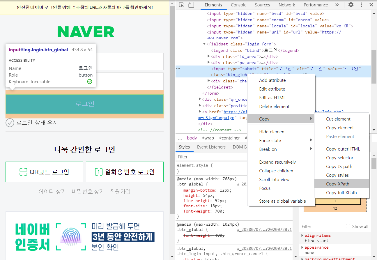 [30] XPath를 이용하여 로그인버튼을 눌러줍니다.